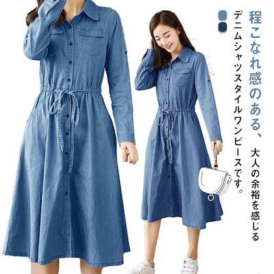 デニムワンピース シャツワンピース デニム レディース 前開き Aライン ボタン 長袖 ロング丈 ポケット付き カジュアル 大人 かわいい 可愛い おしゃれ きれいめ オフィス カジュアル 無