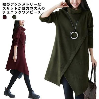 アシメトリーワンピース ックワンピース ワンピース レディース 膝丈ワンピース ワンピース 厚手 長袖 ゆったり チュニック ロング丈 プルオーバー 体型カバー Aライン