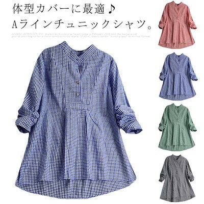 プルオーバーシャツ チュニック ワンピース 長袖 チェック柄 レディース Aライン ロングシャツ 立ち襟 ブラウス