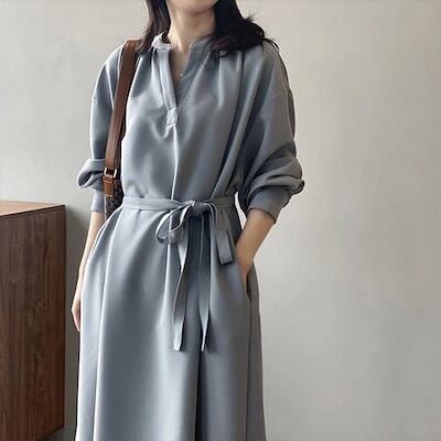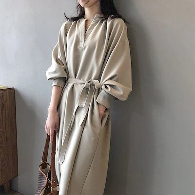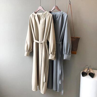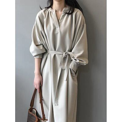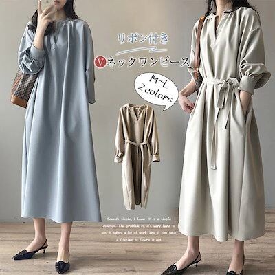 ロングワンピース 長袖 ワンピース ロングワンピース Vネック レディース マキシ丈 ロング丈 無地 リボン付き Aライン ゆったり 綺麗 大きいサイズ 体型カバー きれいめ おしゃれ 通勤 入13
