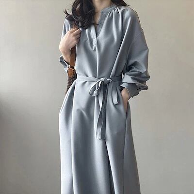 ロングワンピース 長袖 ワンピース ロングワンピース Vネック レディース マキシ丈 ロング丈 無地 リボン付き Aライン ゆったり 綺麗 大きいサイズ 体型カバー きれいめ おしゃれ 通勤 入