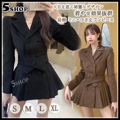 韓国ファッション 人気 新型 スーツの襟ウール ワンピース レディース Aライン プリーツショートスカート 長袖 気質 ウエスト ワンピース