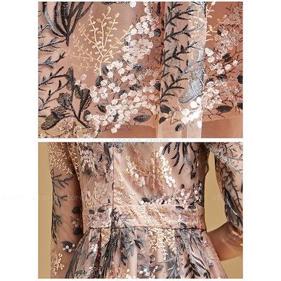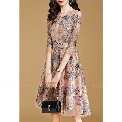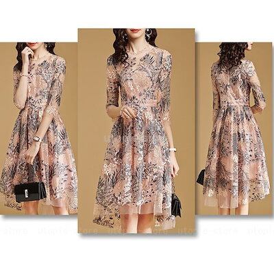 ワンピースドレス レディース 秋服 きれいめ 膝丈ワンピース 七分袖 花柄 レース刺繍ワンピース A
