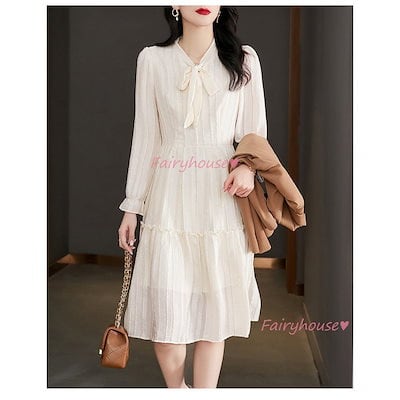 ワンピース レディース 40代 きれいめ 膝丈ワンピース 春夏 長袖ワンピース 白 リボンネック Aラインスカート オシャレ韓国風 大人 通勤OL 結婚式ドレス 30代