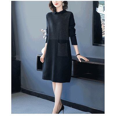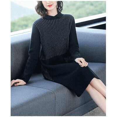 ワンピース ニット ロングワンピース ニットセーター カットソー レディース 膝丈 体型カバー 無地
