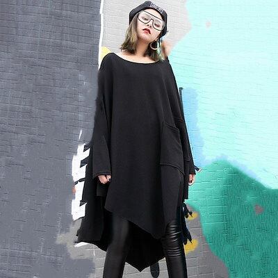 大きいサイズ レディース チュニックワンピ 変形ヘム 黒 長袖 Aライン テールカット 無地 アシメ
