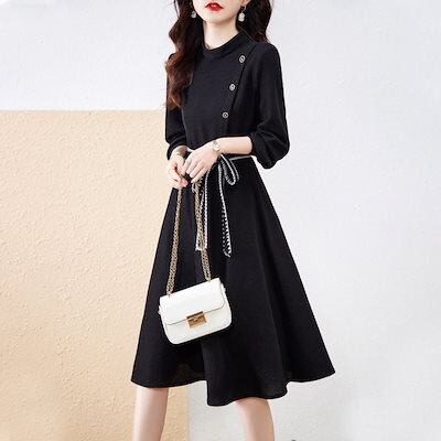 ワンピース レディース 40代 きれいめ 膝丈ワンピース 秋冬 長袖ワンピース 黒リボン Aラインスカート オシャレ大人上品 通勤OL 入学式 卒業式 50代ドレス