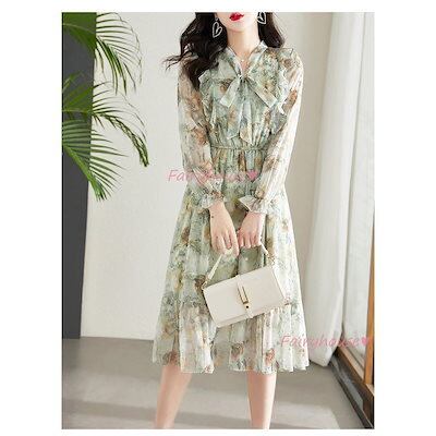 ワンピース レディース 40代 きれいめ 膝丈ワンピース 春夏新作 長袖ワンピース 花柄リボンVネック Aラインスカートオシャレ韓国風 大人 ゆったり 30代 50代