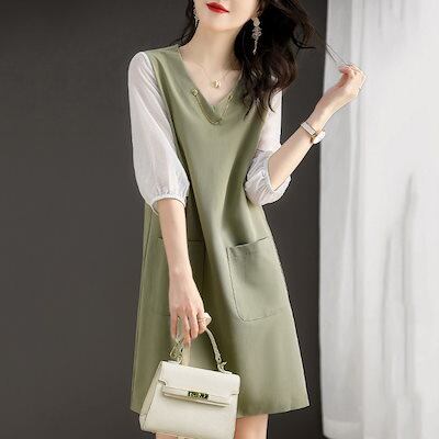 ワンピース レディース 40代 きれいめ 膝丈ワンピース 春秋冬新作 長袖ワンピース Vネック 配色 Aラインスカート オシャレ大人 上品 韓国風 通勤OL 30代50代