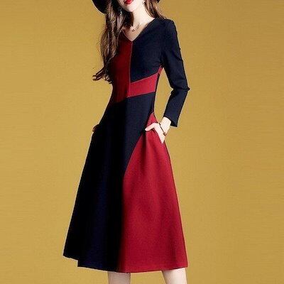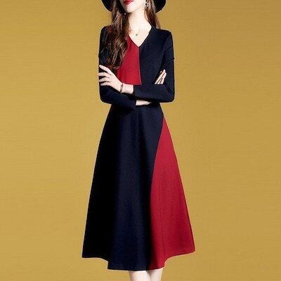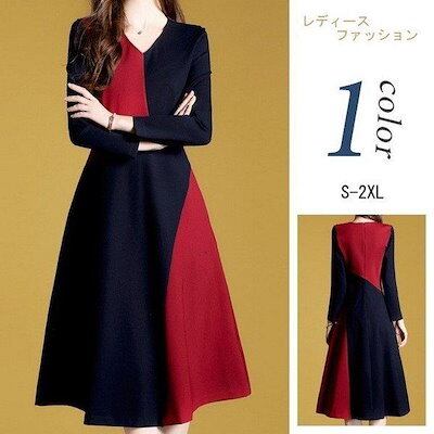 ワンピース レディース 春秋 膝丈ワンピース 大きいサイズ Aライン Vネック きれいめ 長袖 着痩せ 20代/30代/40代 通勤 結婚式 お出かけ