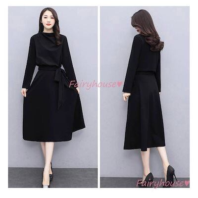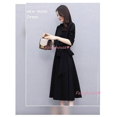 ワンピース レディース 40代 きれいめ マキシワンピース 秋服 長袖ワンピース 黒リボン Aラインスカート オシャレ韓国風 通勤OL 大人 体型カバー 30代 50代
