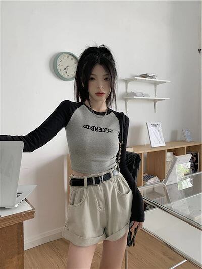 2024夏 韓国 トップス 長袖 可愛い おしゃれ タイトフィット カットソー ラウンドカラー 重ね着丈 スリーブ 女っぽ レディース Tファッション系 フェミニン きれいめ 色っぽ プリント