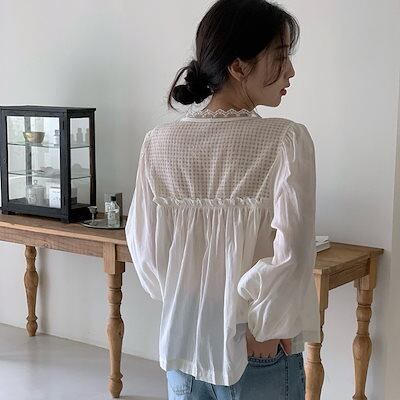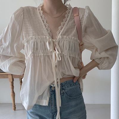 2024 秋冬トップス シャツ 長袖 Vネック 薄手 ゆったり リボン 秋 白 ホワイト おしゃれ かわいい ガーリー キュート 甘め 韓国ファッション レディース お出かけ