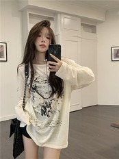 2024 秋冬tシャツ 長袖 ドロップショルダー クルーネック トップス ルーズ レトロ衣装シルエット 韓国系 ファッションサイズ レディース 大人可愛い