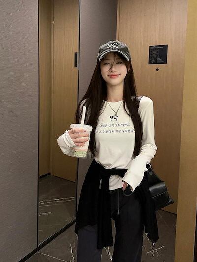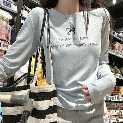 2024 秋冬トップス Tシャツ 長袖 韓国語 ハングル リボン ガーリー 甘め キュート 秋 白 水色 おしゃれ かわいい 韓国ファッション レディース お出かけ