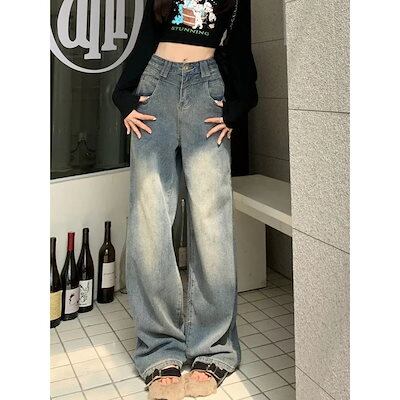 スラックスパンツ ヴィンテージ ストレート デニムパンツ レディース 秋 アメリカンスタイル ハイウエスト ルーズ ワイドパンツ ズボン 韓国