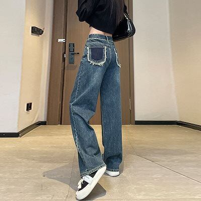 デニムパンツ ワイドパンツ ジーンズ レディース ローエッジ ハイウエスト ルーズ ストレート カラーブロッキング ポケット デザイン モップズボン 韓国