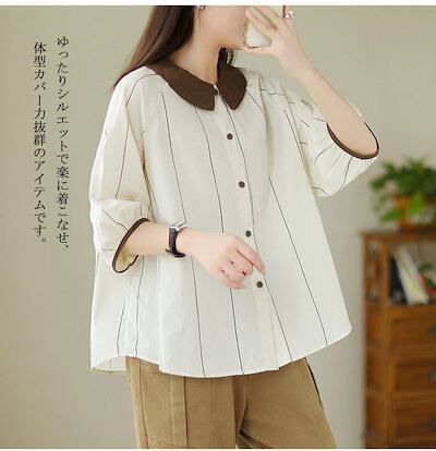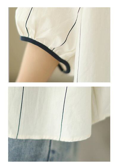 ストライプシャツ 半袖 シャツブラウス レディース パフスリーブ 折り襟 ボタン 前開き ストライプ ブラウス ドッキング ボリューム袖 トップス 大きいサイズ ゆったり 体型カバー 薄手 涼しい き