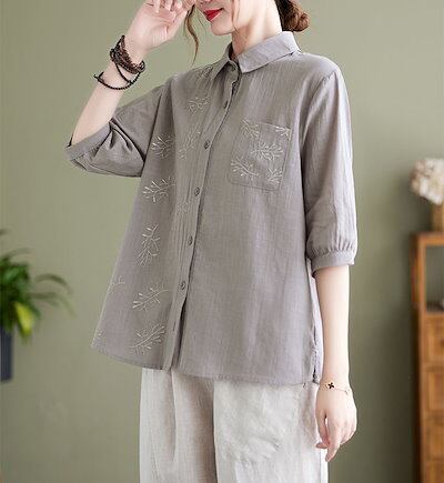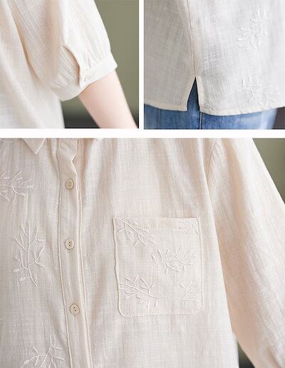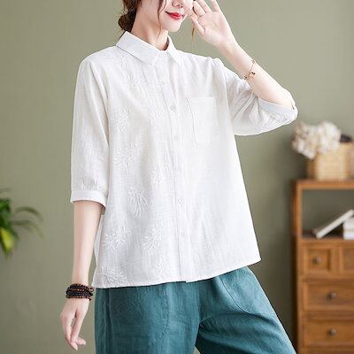 刺繍シャツ レディース 綿 麻 シャツ 半袖シャツ 春 夏 五分袖 折り襟 前開き ボタン 白シャツ 刺繍 半袖 ポケット付き コットン リネン トップス 通気 カジュアル きれいめ リネンシャツ ゆ