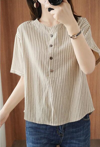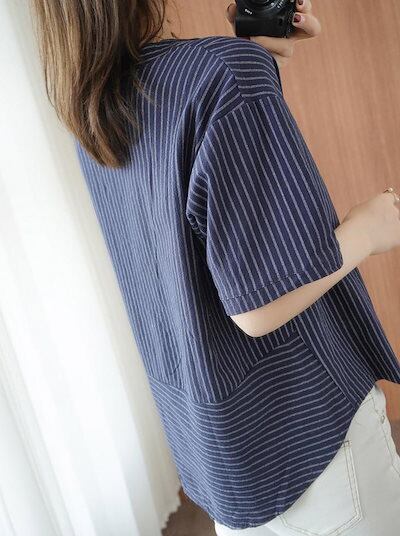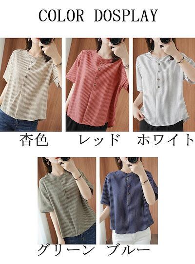 ストライプ ブラウス 半袖 シャツ レディース 春夏 シャツブラウス ドッキング コットン バンドカラー ボタン プルオーバー ストライプ柄 トップス ゆったり 大きいサイズ 体型カバー Tシャツ 通