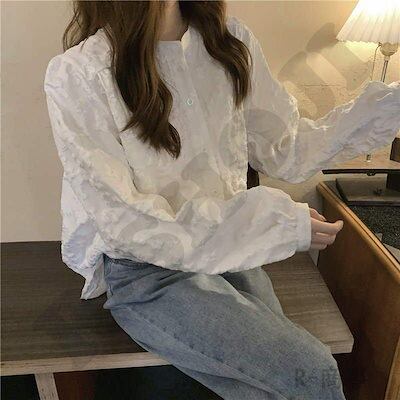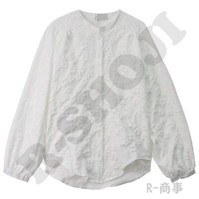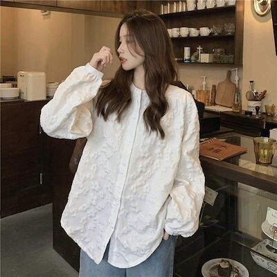 白シャツ シャツブラウス 春夏 きれいめ 長袖 春物 レディース 前開き ボリューム袖 ゆったりラウンドネック レース ボタン止め フレア裾口
