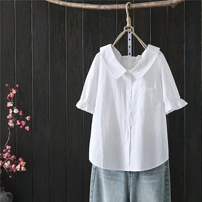 ストライプ シャツブラウス フリル レディース ギャザー 夏 シャツ 半袖 ブラウス 綿 フリル襟 トップス バックタック 全開 ボタン止め 可愛い 折襟 半袖シャツ ナチュラル 大人 カジュアル風