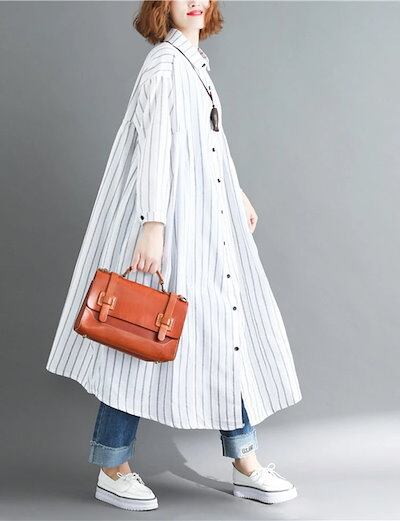ストライプシャツ レディース 長袖 ロングシャツ 夏 開襟 折り襟 ボタン留め 長袖シャツ 薄手 カーディガン ゆったり カジュアルシャツ ロング ドロップショルダー 羽織り アウター ライトアウター