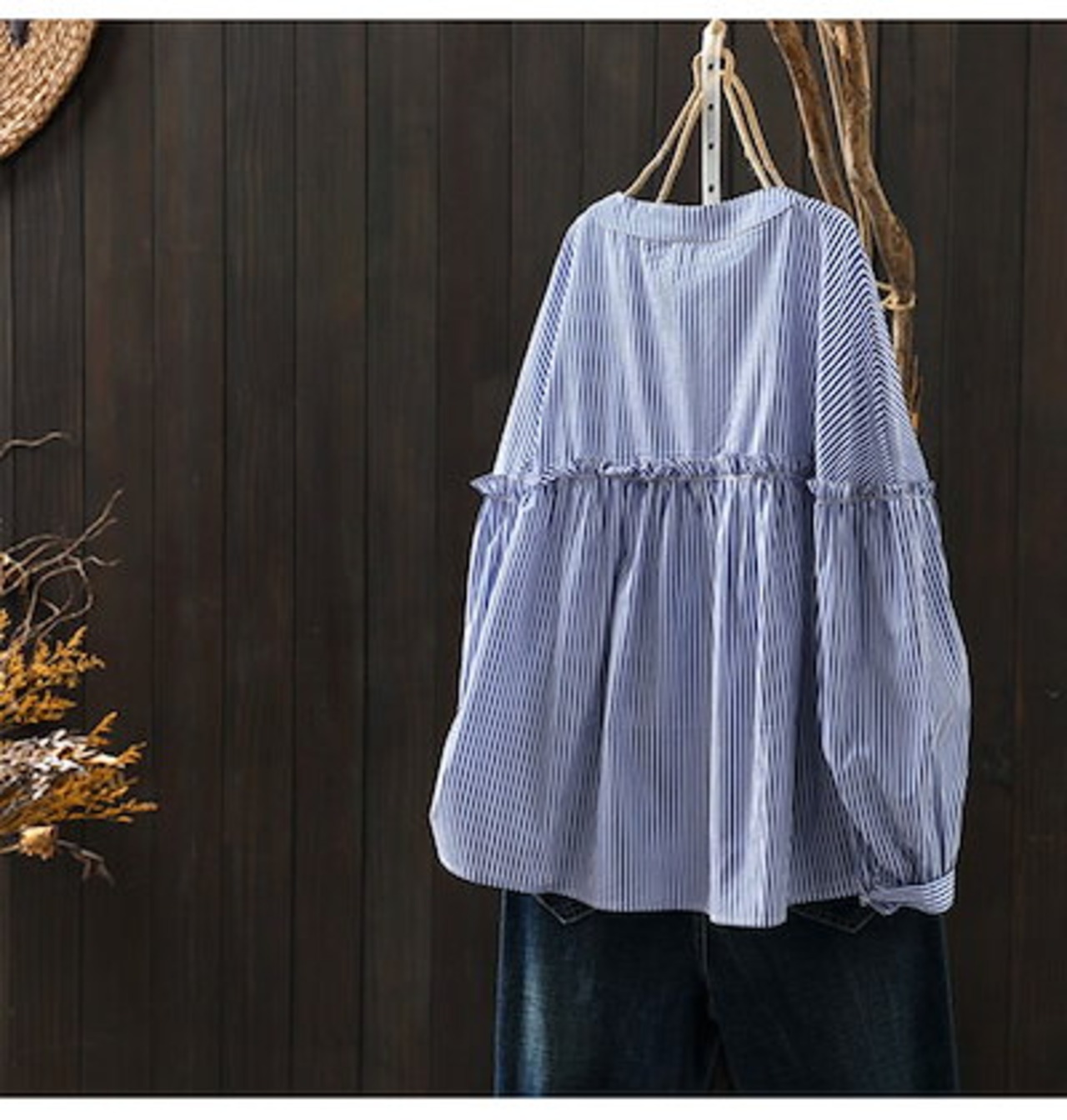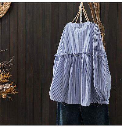 ストライプ シャツ 長袖 レディース きれいめ フリル 綿 コットン 羽織る 羽織れる トップス バンドカラー シャツブラウス ボタン 前開き ワイシャツ 柄 ギャザー 体型カバー ゆったり ライトア