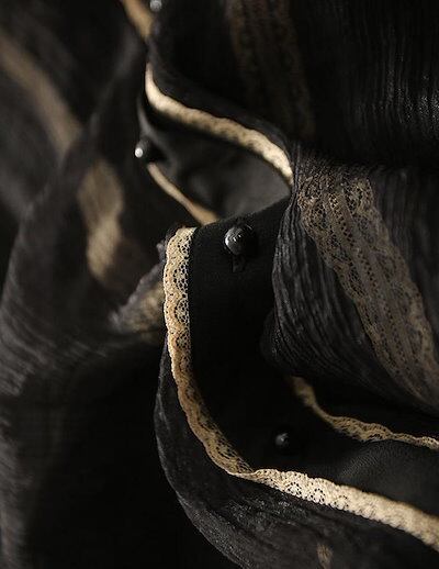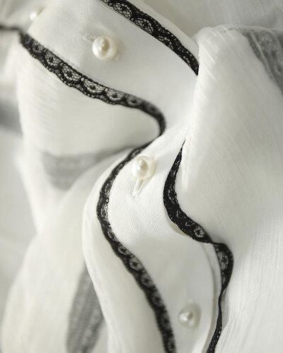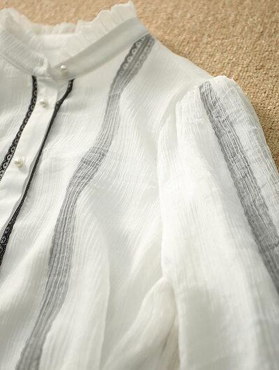 シャツ 長袖 レディース フォーマル オフィス 黒 白 ワイシャツ トップス フリル襟 ドッキング 異素材切り替え シャツブラウス バルーン袖 2枚重ね 透けない ブラウス 前開き ボタン留め きれい