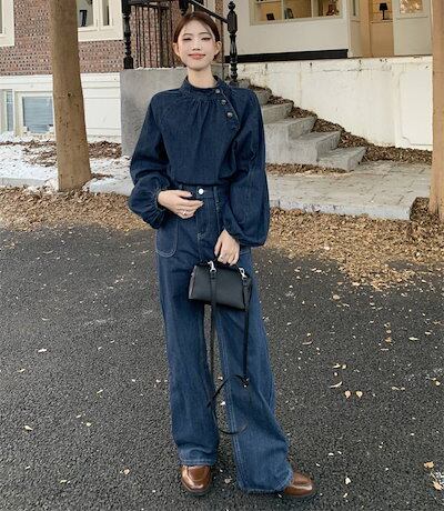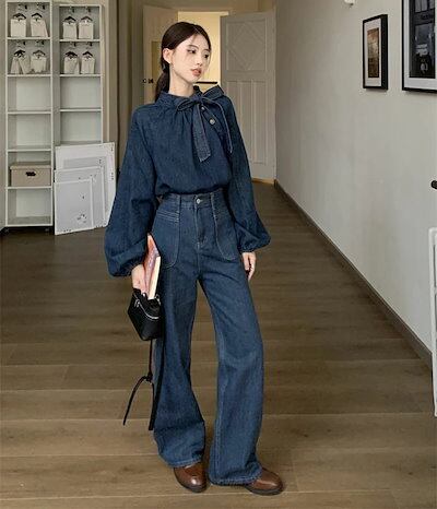 ボウタイブラウス レディース 長袖 プルオーバー ブラウス デニム ボウタイ トップス プチハイネック シャツブラウス バルーン袖 ボリュームスリーブ 斜めボタン 春秋 春 カジュアル おしゃ