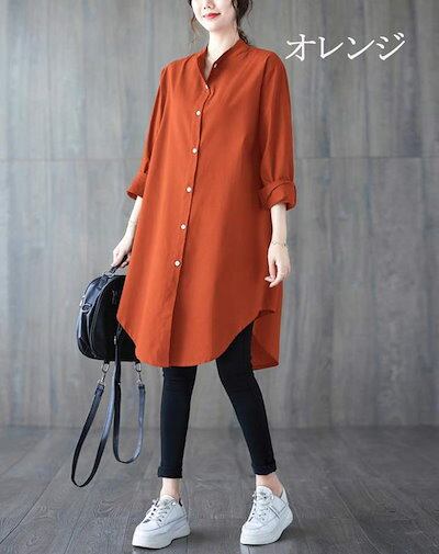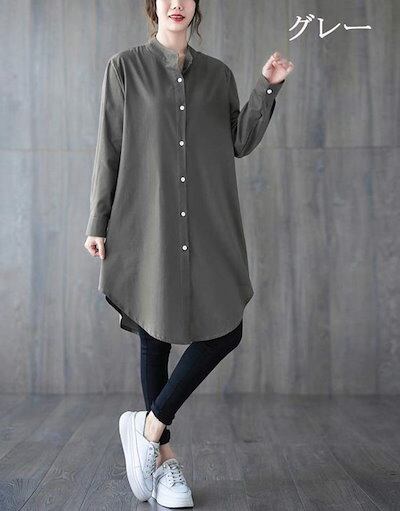 シャツ レディース 長袖チュニック ロング トップス 秋 チュニックシャツ バンドカラー 無地 ロングシャツ 立ち襟 ボタン ラウンドヘム 長袖シャツ ひざ丈 前開き シャツワンピース 秋冬 大きいサ