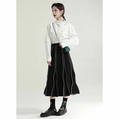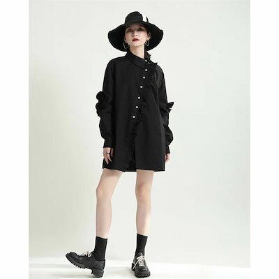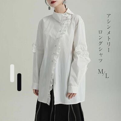 フリルシャツ ブラウス レディース トップス ロング丈 シャツ デザイン襟 長袖 斜めボタン 胸元フリル タック 無地 きれいめ モード系 変形デザイン アシンメトリー シャツ オケージョン きれいめ