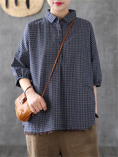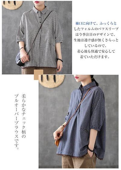 綿麻風 シャツ ブラウス レディース 半袖 シャツブラウス おしゃれ シャツ レディース シャツブラウス レディース 大きいサイズ チェック ゆったり トップス ボタン 綿麻調 裾レース切り替え レト