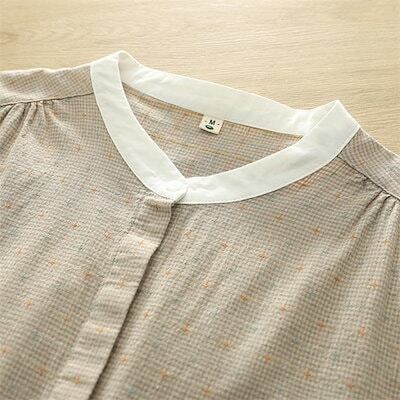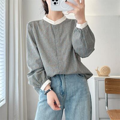 千鳥柄 シャツ ブラウス 長袖 バンドカラー 配色 シャツブラウス レディース 前開き ボタン トップス カラフル刺繍 長袖シャツ ラウンドヘム ギャザー ゆったり 大きいサイズ 体型カバー カジュア