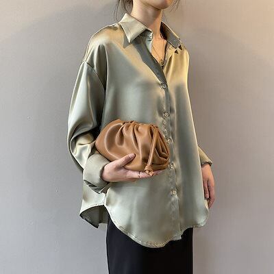シャツ ブラウス レディース トップス 長袖 ロングスリーブ 襟付き 前開き 無地 春 夏 春夏 サテン とろみ感 フロントボタン 光沢 高級感 ゆったり 体型カバー エレガント シンプル モダン 4
