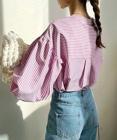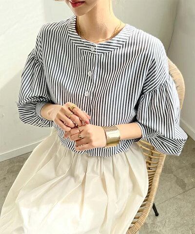 シャツ レディース ストライプ ブラウス 春 夏 秋 長袖 ドルマン トップス ボタン ぽわん袖 体型カバー バンドカラー カジュアル ボリューム袖 ストライプシャツ キレイめ 通勤 大人 スッキリ