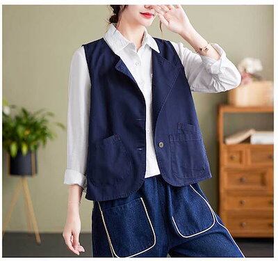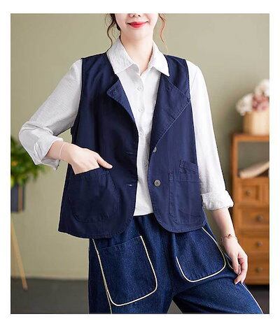 春夏ベスト レディース ベスト クルーネック 無地 ノースリーブ ショート丈 トップス 前開き 羽織り 袖なし ポケット カジュアル ナチュラル シンプル 大きいサイズ ゆったり 大人 レイヤード 重