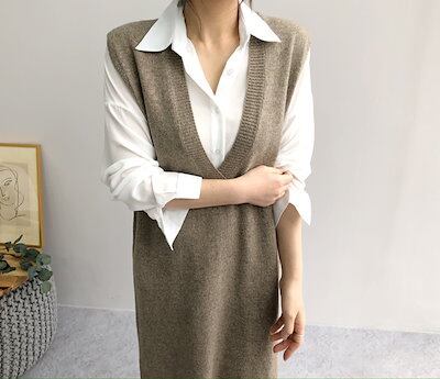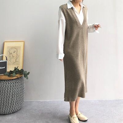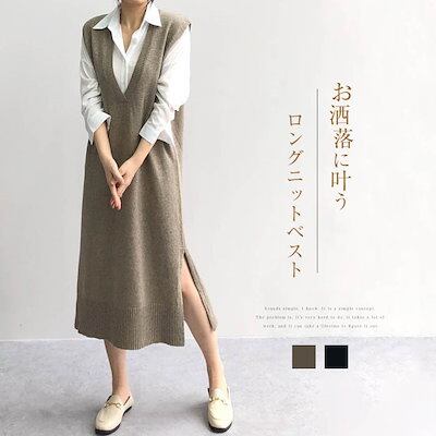 ニットベスト ロング ロングニットワンピース レディース ノースリーブワンピース ロングニットベスト レイヤード 重ね着 vネック ワンピース スリット 春秋冬 ミモレ丈 カジュアル 大人 プルオー