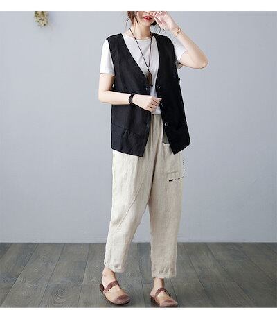 ジレ ベスト レディース 春夏 前開き 可愛い ジレ 夏 綿麻風 ベスト 薄手 夏服 ノースリーブ 無地 カジュアル ベスト Vネック トップス ジレベスト 羽織り 袖なし 大きいサイズ ゆったり 体