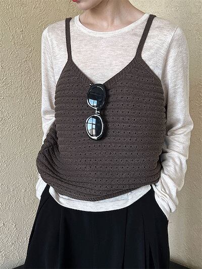ニットベスト ベスト レディース キャミソール 春 秋 冬 ニット キャミ セーター ニットビスチェ ベスト トップス ノースリーブ レイヤード プルオーバー Vネック 無地 透かし彫り ストレッチ