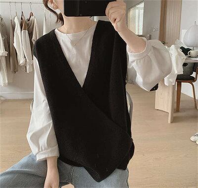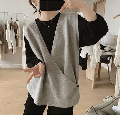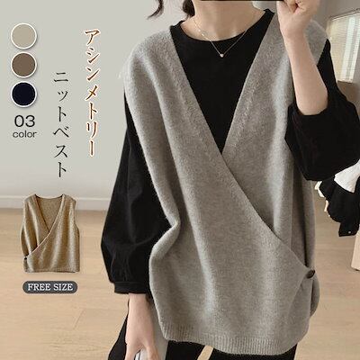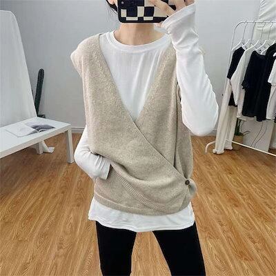 ニットベスト レディース ジレ 春 秋 冬 プルオーバー ニットトップス 春ベスト Vネック着回し おしゃれ ノースリーブ ボタン アシンメトリー ニットソー 体型カバー シンプル 無地 カジュアル