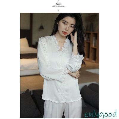 パジャマ ルームウェア レディース 春夏秋 長袖 パジャマ 前開きルームウェア レースVネック レション ロングパンツ上下セット 大人可愛いパジャマ 女性 部屋着