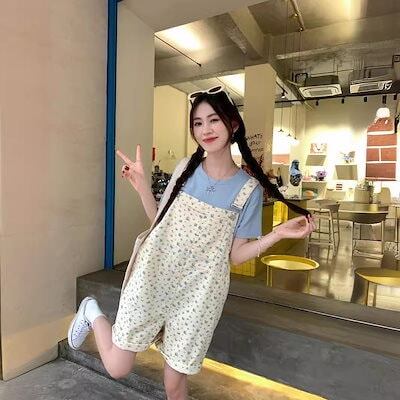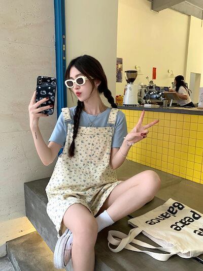 コーデ完成!サロペット 時短コーデ イチオシオールインワン 韓国ファッション 花柄デニムバックパンツ レディース 春 ゆったり ワイドパンツ ハイウエスト ストレートパンツ ショートパンツ 新作