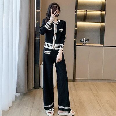 【新作入荷】ブランドニットセットアップニットトップスワイドパンツ ハイウエスト着痩せ効果パンツ韓国ファッションレディース春服上下二点セットアップ orange