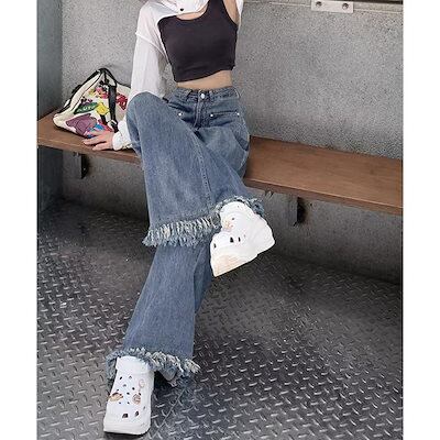 新追加 2025 新作春 脚長効果! デニムパンツ レディース ワイドデニムパンツ 裾フリンジ ジーパン