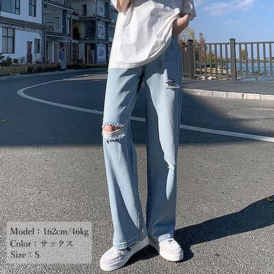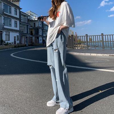 新追加 2025 新作春 脚長効果! デニムパンツ レディース ワイド デニムパンツ ダメージ加工脚長
