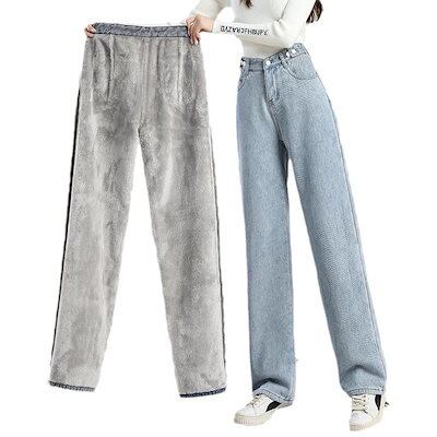 デニムパンツ 裏起毛 厚手 ワイドパンツ 新作 レジャー ゆったり ハイウエスト 細い ストレート レディース 韓国ファッション