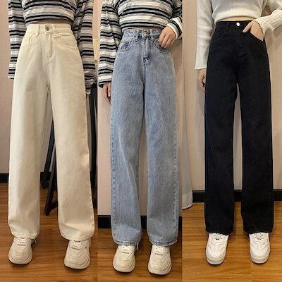 新商品 韓国 レトロ ホワイト ジーンズ レディース ゆったり ストレート ジョガーパンツ 着痩せ ワイドパンツ