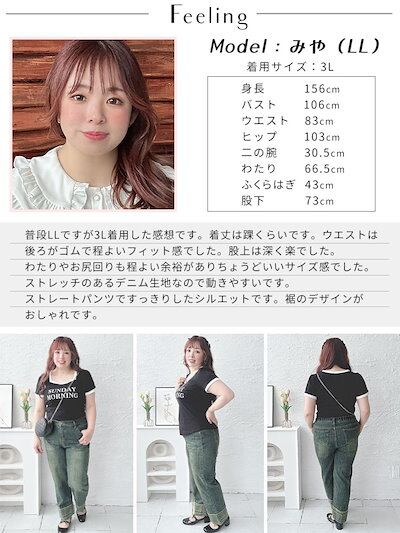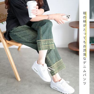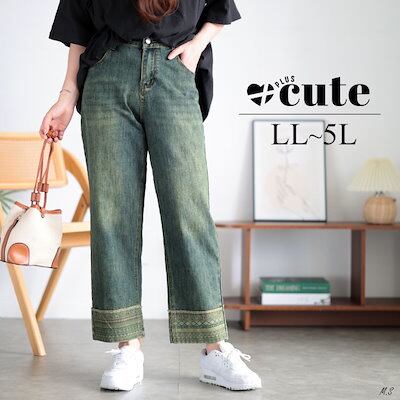 ゴールドジャパン大きいサイズ レディース ボトムス ズボン パンツ デザイン裾ストレッチデニムパンツ ロング 裾 柄 デニム ストレート ウエストゴム ストレッチ 無地 春新作 春服 夏服 秋服 冬服 LL 2L 3