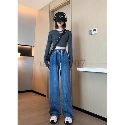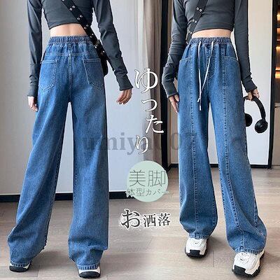 超?折扣-新作 デニムガウチョ ワイドデニム ワイドパンツ ガウチョ レディース ジーンズ デニムパンツ 大きいサイズ ハイウエスト ウエストゴム 体型カバー